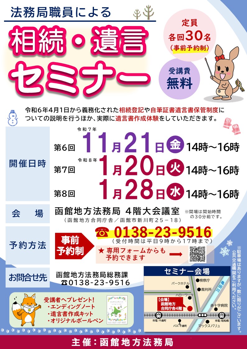予約は、☎0138ー23-9516(函館地方法務局総務課、9時から17時まで)に電話をするか、こちらの専用フォーム(又はQRコード)からお申込みください。