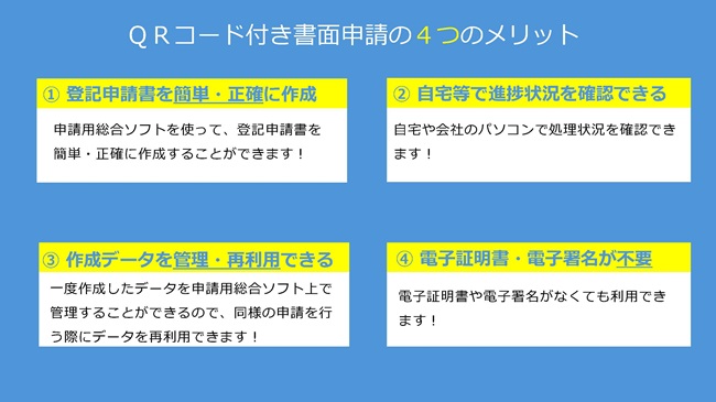 「QRコード(二次元バーコード)付き書面申請」とは、「申請用総合ソフト」という専用のソフト(無料)を利用して作成した申請書の情報を、インターネット経由で事前に登記所に送信した後、その内容を登記申請書として印刷して、登記所に提出する書面申請の方法です。この登記申請書には、申請書の情報が事前に登記所に提出されていることを示すQRコードが自動に印字されます。