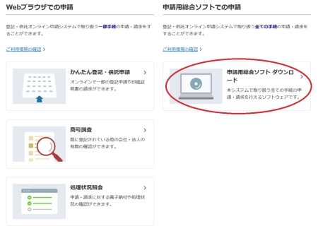 >>登記・供託オンライン申請システム「申請用総合ソフト ダウンロード」を選択してください
