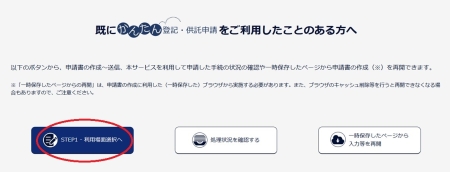 - 「かんたん登記・供託申請」をクリックし、「Step1-利用場面選択へ」をクリックする