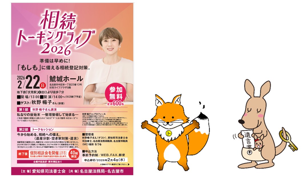 そのとき頭を抱えないために、今回は遺産分割、空き家、遺言をテーマに、今から準備しておくべきことを、相続登記の義務化に関する情報を含めて、名古屋法務局や名古屋市の職員、司法書士がご紹介します。ゲストにお迎えするのは、俳優として、ポジティブに生きる女性として多方面で活躍する秋野暢子さん。ご自身の経験も踏まえたお話をいただいた後、MC福田ちづるさんも交えて相続トーキ(登記)ングします。