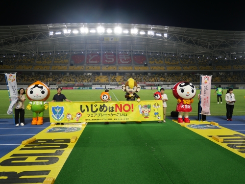また、ハーフタイムには、トッキーと人KENまもる君&人KENあゆみちゃんと一緒に「いじめはNO!~フェアプレーがかっこいい~」と書かれた横断幕を掲げ、大勢の観客のみなさんにいじめ防止を訴えました。